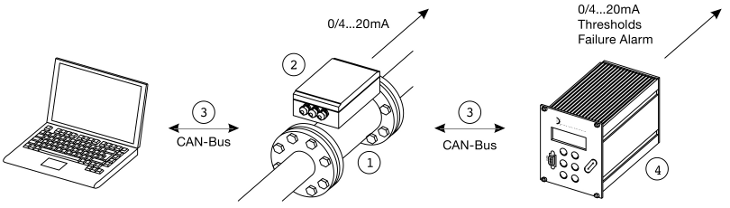 测量装置包括在由传感器技术(1)、“智能”测量电子单元(2)和DYNAcon通信单元(4)组成的流程线上实现的过程连接。最大长度为1000米的数字连接电缆(3)提供了高度的抗噪声性,并且在几个测量点的布线工作非常少,因为它允许多达十个系统连接在一条线上。